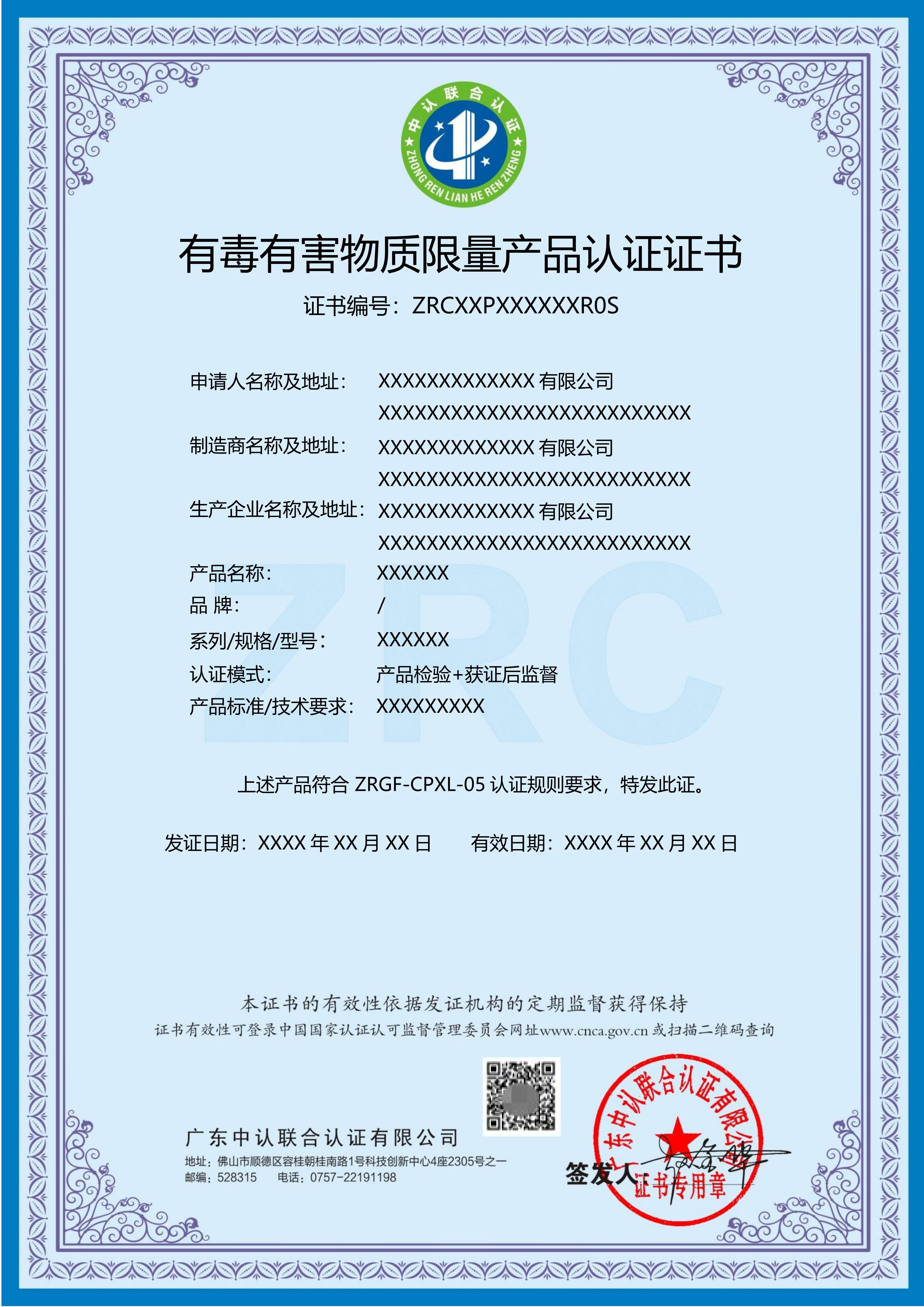 有毒有害物质限量认证证书是由认证机构依据相关标准和法规,对产品中的有毒有害物质含量进行检测和评估后颁发的证明文件。该证书表明产品中的有毒有害物质含量在规定的限量范围内,符合安全、环保的要求。
